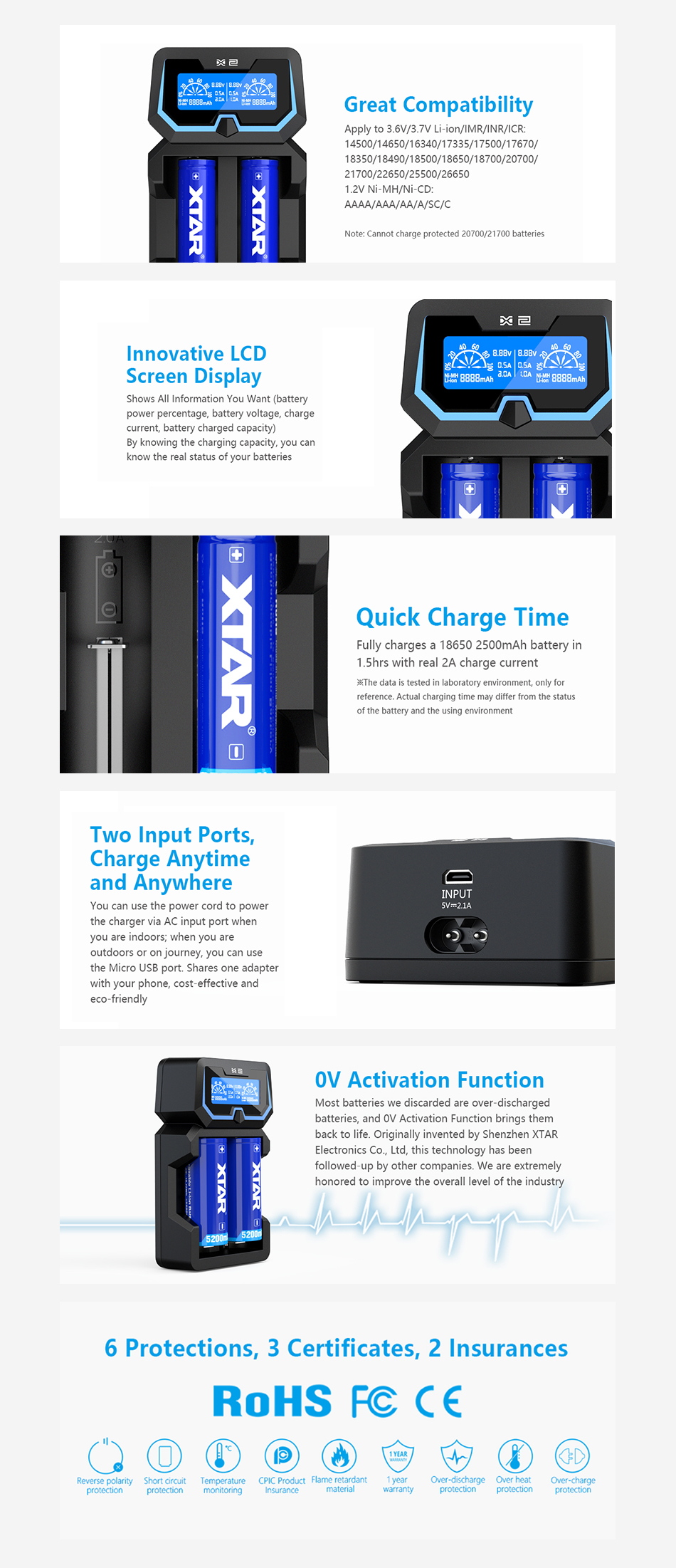 - Gran compatibilidad --- Apliqúese a 3.6V / 3.7V Li-ion / IMR / INR / ICR, 1.2V Ni-MH / Ni-CD