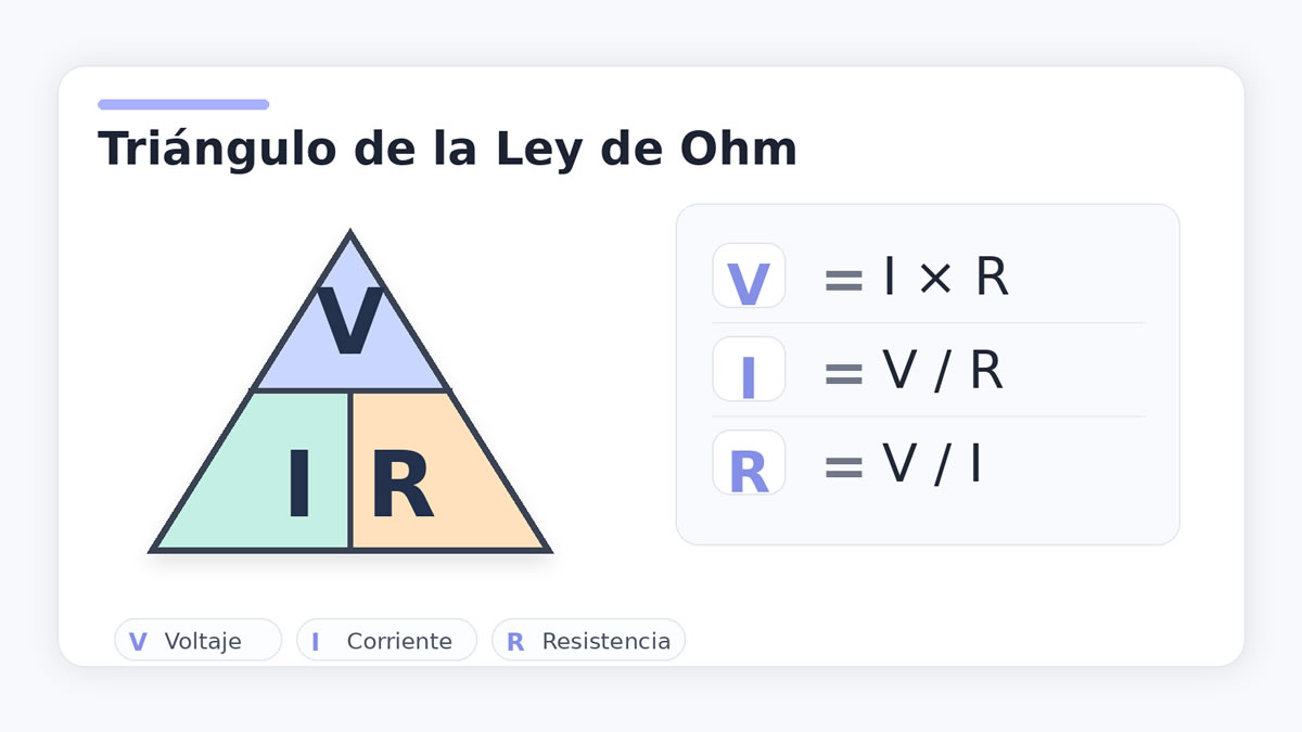 Una forma fácil de recordar las distintas combinaciones para calcular Voltaje, Intensidad de corriente y Resistencia es usando el Triángulo de la Ley de Ohm.