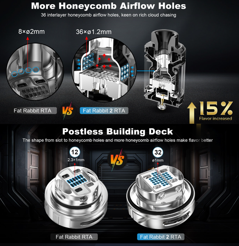 Hellvape vuelve a la carga pisando fuerte con la nueva versión del ya conocido Fat Rabbit, en esta ocasión el Fat Rabbit 2 RTA. Esta nueva versión incorpora mejoras en el flujo de aire tanto interior como superiores para aumentar el sabor y la cantidad de vapor que aporta. Además de una gran capacidad para nuestros Eliquid favoritos.
