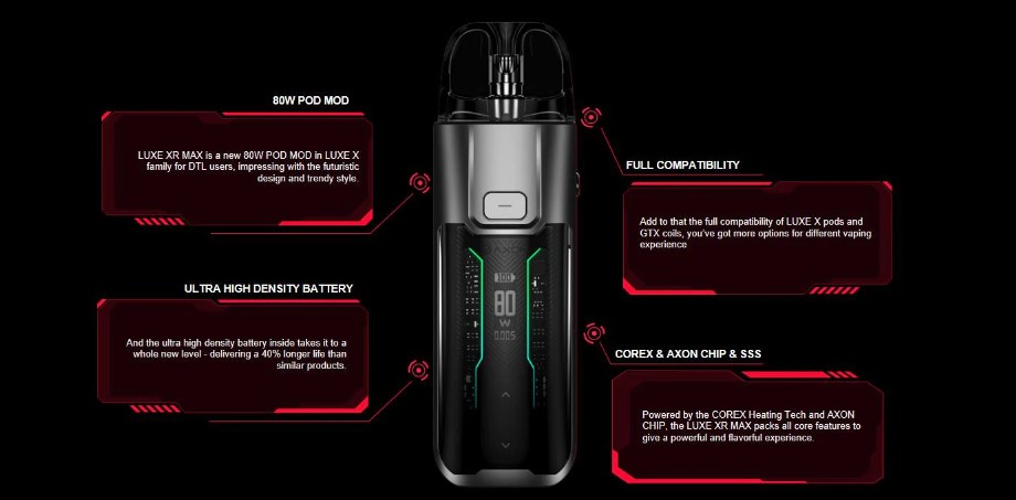 - La potencia de 80W que ofrece el Vaporesso Luxe XR Max permite disfrutar de una producción de vapor densa y sabores intensos, lo que lo convierte en una excelente elección para aquellos que buscan una experiencia de vapeo potente y satisfactoria.