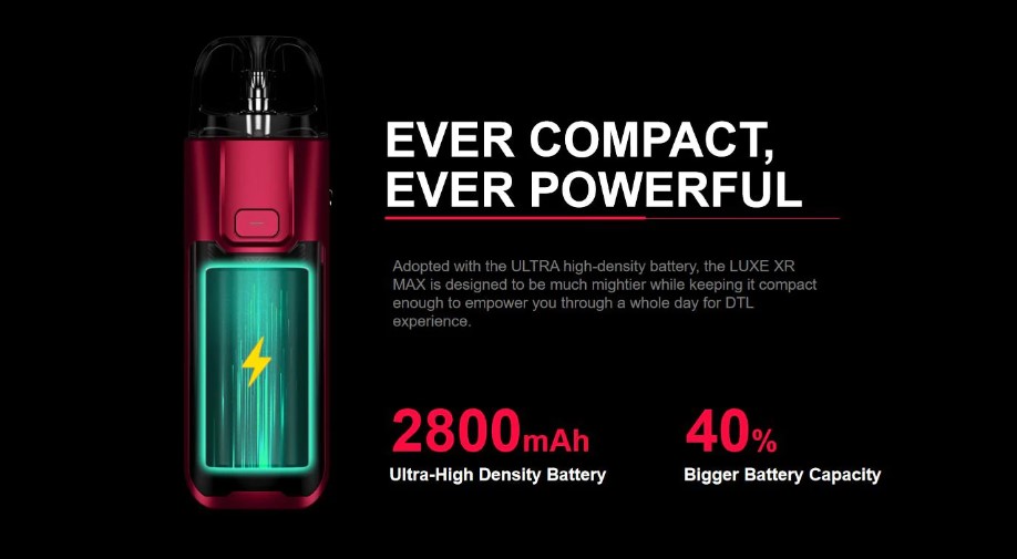 El Vaporesso Luxe XR Max destaca por su impresionante batería de 2800mAh, que garantiza una larga duración del dispositivo. Con esta capacidad, los usuarios disfrutarán de sesiones prolongadas de vapeo sin preocuparse por quedarse sin energía en el momento menos oportuno.