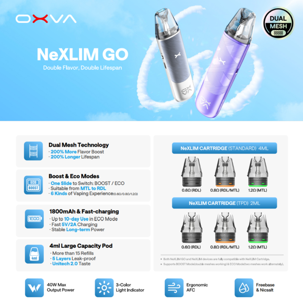 El Oxva NeXLIM Go Pod Kit es un dispositivo innovador que lleva el vapeo al siguiente nivel gracias a su exclusiva tecnología Dual Mesh. Esta tecnología ofrece un 200% más de intensidad de sabor y una duración de coil hasta un 200% más larga, asegurando una experiencia más satisfactoria y económica.