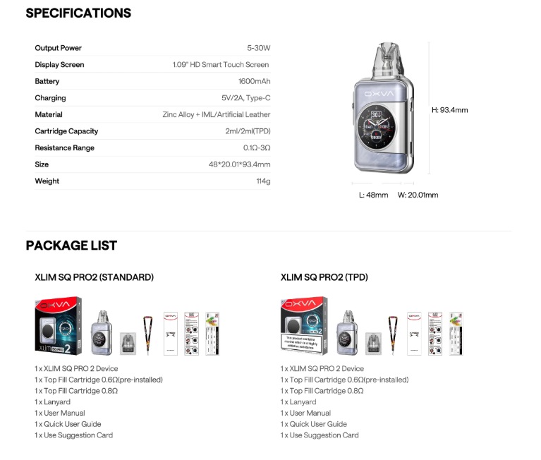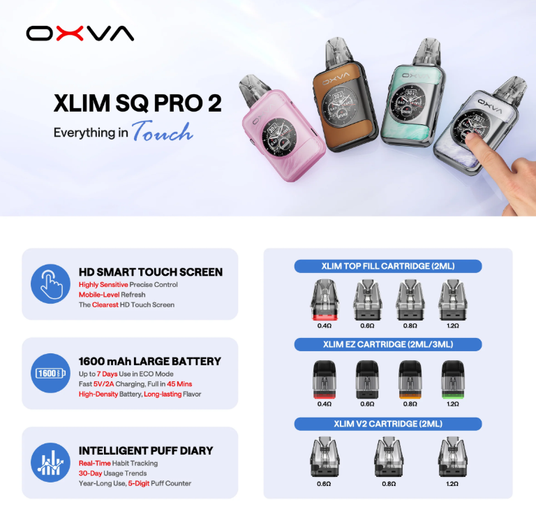 Una de sus características más destacadas es su pantalla táctil HD SMART de 1.09" con un control muy preciso y hasta 64 combinaciones posibles de elementos visuales. Cuenta con una batería integrada de 1600 mAh con modo ECO aguanta mas tiempo la dureación de uso y carga completa en tan solo 45 minutos. Con potencia ajustable hasta 30 W y una entrada de flujo de aire mejorada, el Xlim SQ Pro 2 garantiza una experiencia de vapeo potente y personalizable. Está disponible en 10 colores y acabados distintos, todos elegantes y con un diseño único. Su superficie es suave al tacto, ofreciendo una sensación agradable y destacando por su calidad y estilo.
