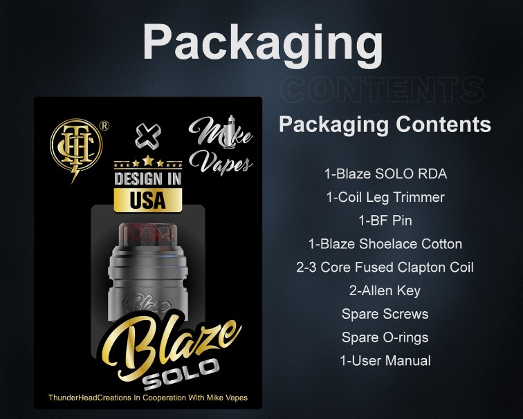 Blaze Solo RDA de THC diseñado por Mike Vapes con la campana grabada con el nombre del modelo tiene una plataforma de construcción Single Coil sin postes con una curva “Victor”.