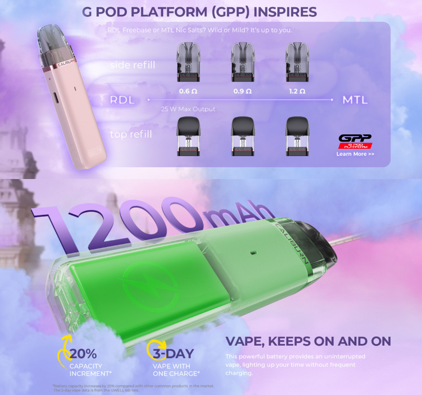 Equipado con una batería integrada de 1200mAh, el Caliburn G3 Lite ofrece una impresionante duración de batería que garantiza un uso prolongado sin necesidad de recargas constantes. Esta capacidad de la batería es ideal para usuarios que están en movimiento o que disfrutan de largas sesiones de vapeo sin interrupciones.