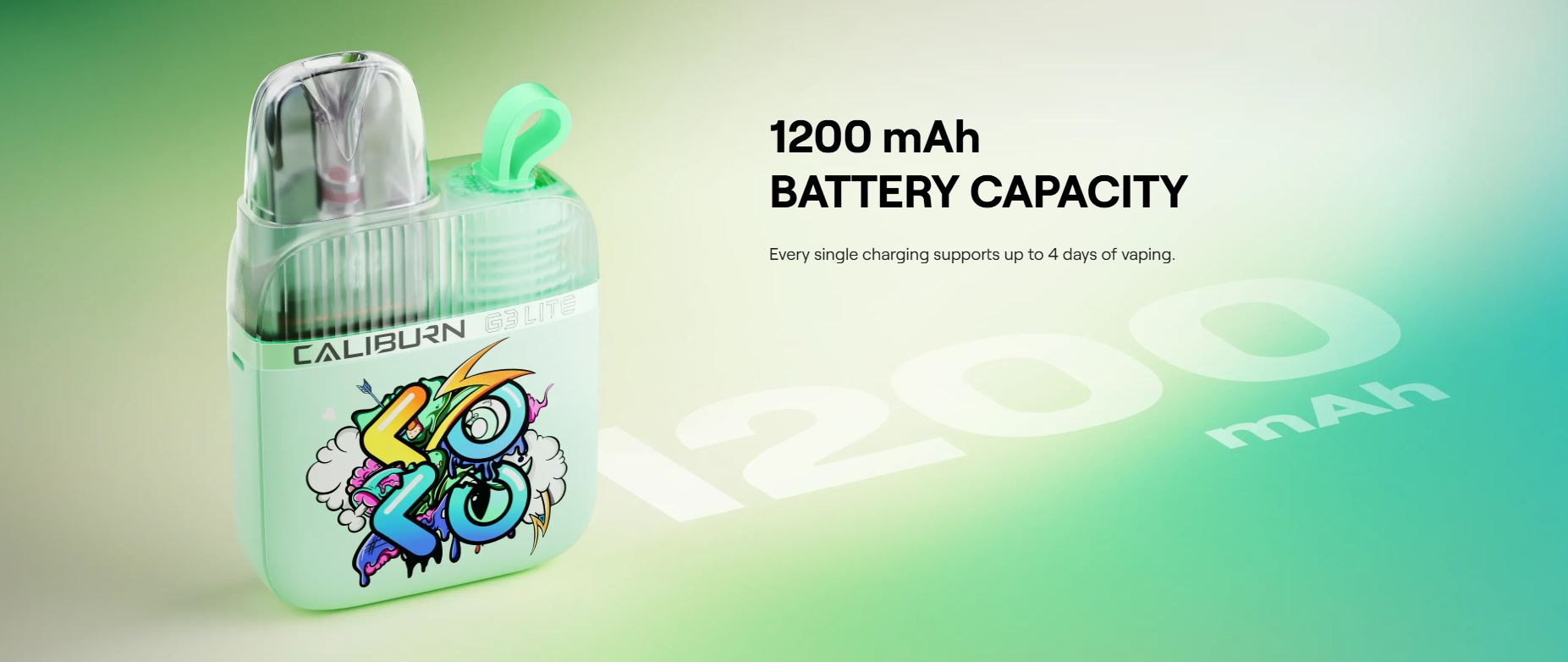 Equipado con una batería integrada de 1200mAh, el Caliburn G3 Lite ofrece una impresionante duración de batería que garantiza un uso prolongado sin necesidad de recargas constantes. Esta capacidad de la batería es ideal para usuarios que están en movimiento o que disfrutan de largas sesiones de vapeo sin interrupciones.