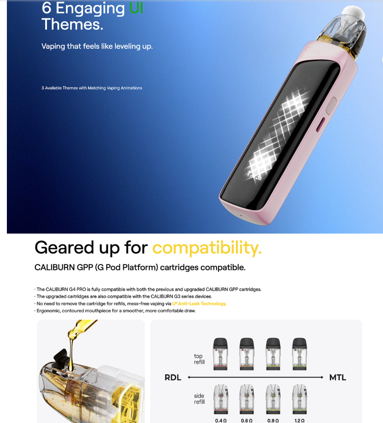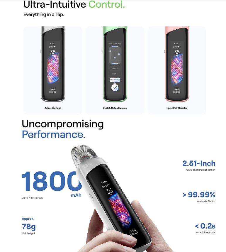 Es un pod recargable de última generación con pantalla táctil táctil de 2,51″ ultrarresistente, batería interna de 1800 mAh, potencia ajustable de hasta 35 W y compatibilidad total con cartuchos Caliburn GPP y G3. Destaca por su diseño robusto con chasis de aleación y una interfaz táctil con múltiples temas visuales personalizables, modos de vapeo inteligentes y fluido control de flujo de aire.