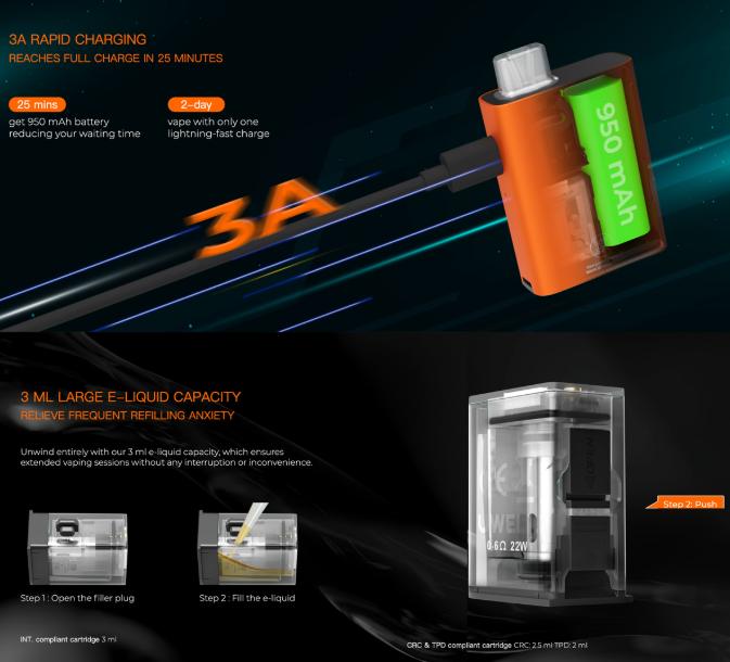 Este dispositivo es capaz de ofrecernos una potencia máxima de hasta 22 W, para un rendimiento óptimo tanto en caladas MTL como RDL. Ideal para aquellos que buscan un equilibrio entre sabor y cantidad de vapor.