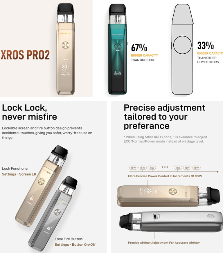 El XROS Pro 2 sirve como dispositivo todo-en-uno que integra batería recargable, potencia ajustable y sistema de pod rellenable. Permite personalizar la experiencia de vapeo mediante el control del flujo de aire, selección de modos de potencia y compatibilidad con todos los cartuchos de la serie XROS.