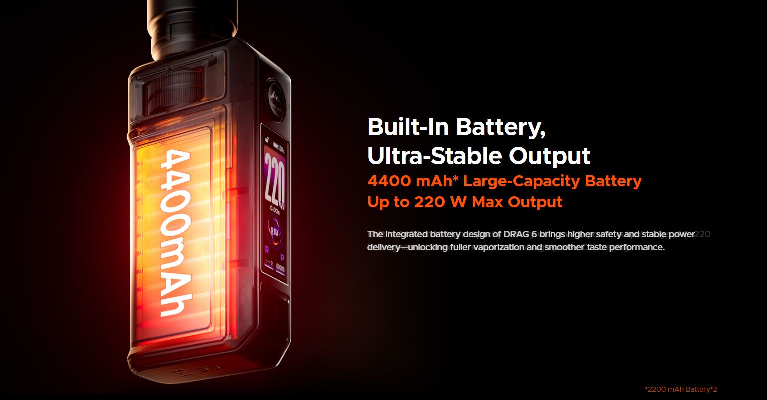 Gracias a su doble batería integrada de 2200 mAh (4400 mAh en total), el Drag 6 garantiza una autonomía duradera incluso a potencias elevadas. Además, incorpora carga rápida USB-C de 3A, reduciendo considerablemente el tiempo de recarga para que vuelvas a vapear en menos tiempo.